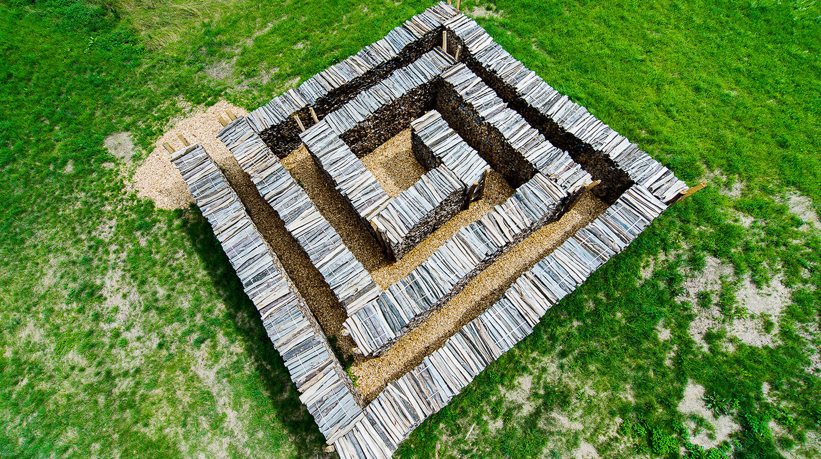 Im Zentrum steht ein Labyrinth, das seine ursprüngliche Aufgabe bewusst verfehlt. Der Besucher irrt nicht lange durch diverse Wege, sondern wird direkt durch nur einen Gang ans Ziel geführt.