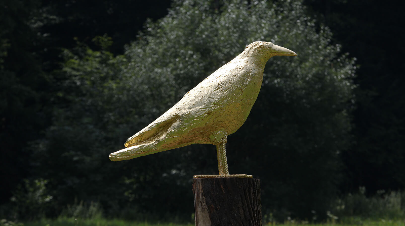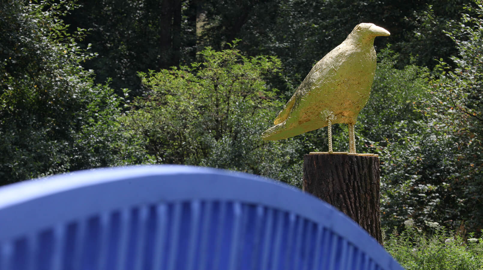Des Weiteren bilden die blaue Brücke und der vergoldete Rabe den Rahmen der Installation. Ausgehend von der Farbe Blau steht alles unter dem Zeichen des Einklangs, der Zufriedenheit und der Harmonie.